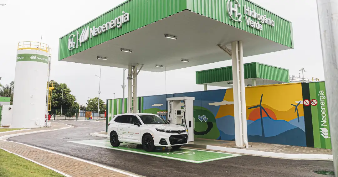 Na planta da Neoenergia, a água é purificada e direcionada para eletrolisadores. A corrente elétrica separa as moléculas, liberando oxigênio (que vai para a atmosfera) e hidrogênio. Este hidrogênio é então comprimido a altas pressões (700 bar para automóveis como o CR-V e 350 bar para caminhões e ônibus) e resfriado para ser armazenado com segurança.