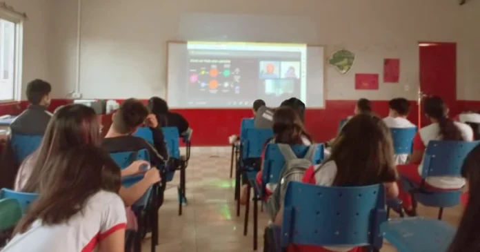 A participação pode ser organizada de duas maneiras: na escola, com a exibição coletiva do material e mediação do professor para envio das perguntas, ou de forma individual, com alunos e professores acessando o conteúdo de casa via dispositivos móveis ou computadores.
