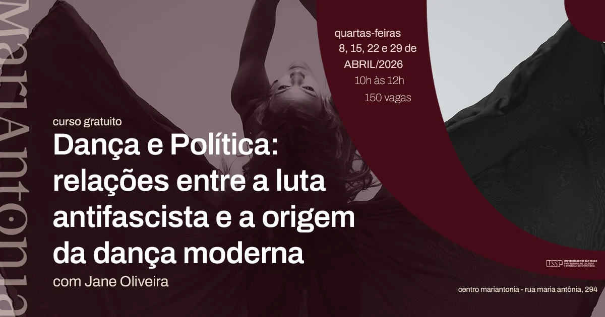 O Centro MariAntonia da USP está com inscrições abertas para o curso gratuito “Dança e Política: relações entre a luta antifascista e a origem da dança moderna”. Com quatro encontros presenciais agendados para abril de 2026, o curso propõe uma reflexão aprofundada sobre a dança como potente ferramenta de luta política, explorando a resposta de artistas da dança moderna ao fascismo na Alemanha e nos Estados Unidos durante os anos 1930.